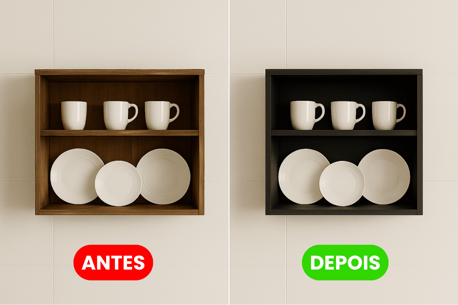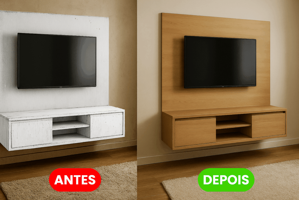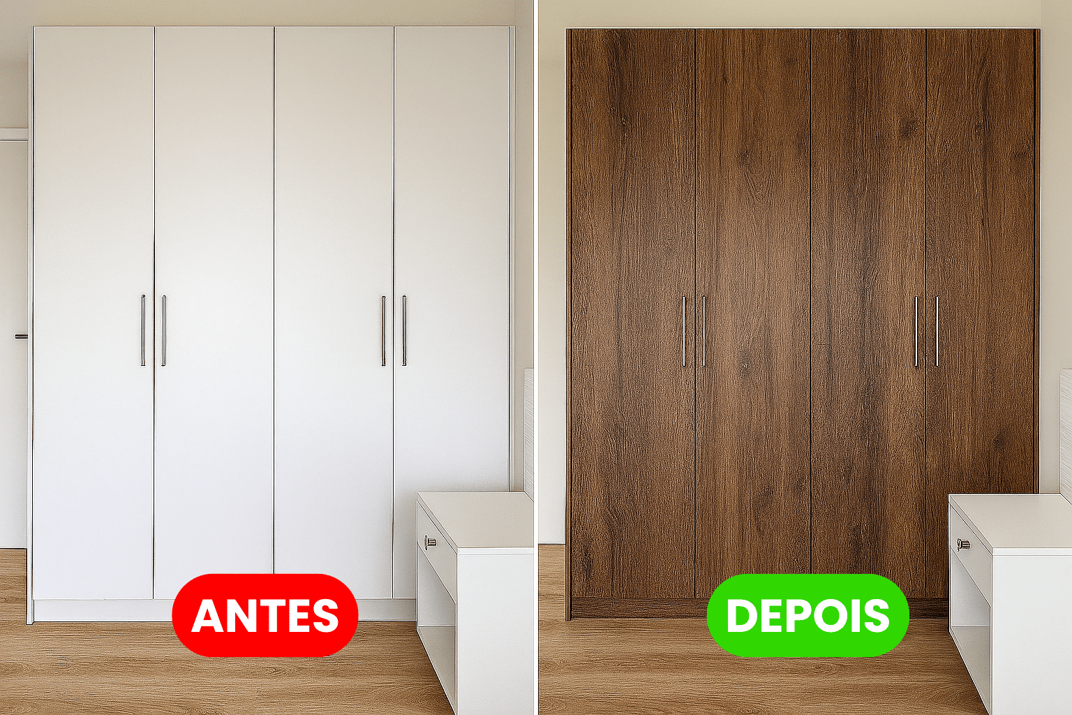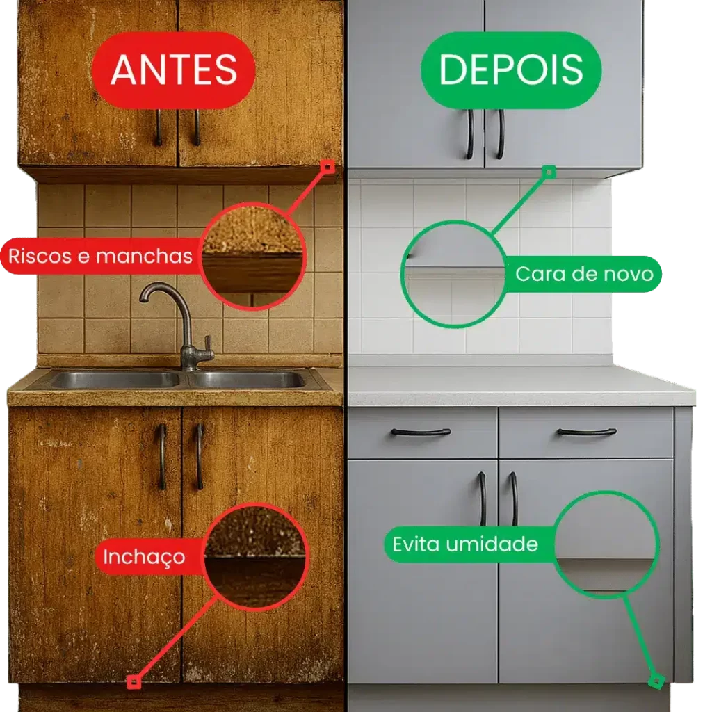 Trabalhamos apenas com vinil de alta durabilidade, da mesma linha usada em envelopamento automotivo. São materiais resistentes à umidade, calor e fácil de limpar no dia a dia. Você pode escolher entre cores sólidas, texturas como inox escovado, madeira ou até estampas personalizadas.